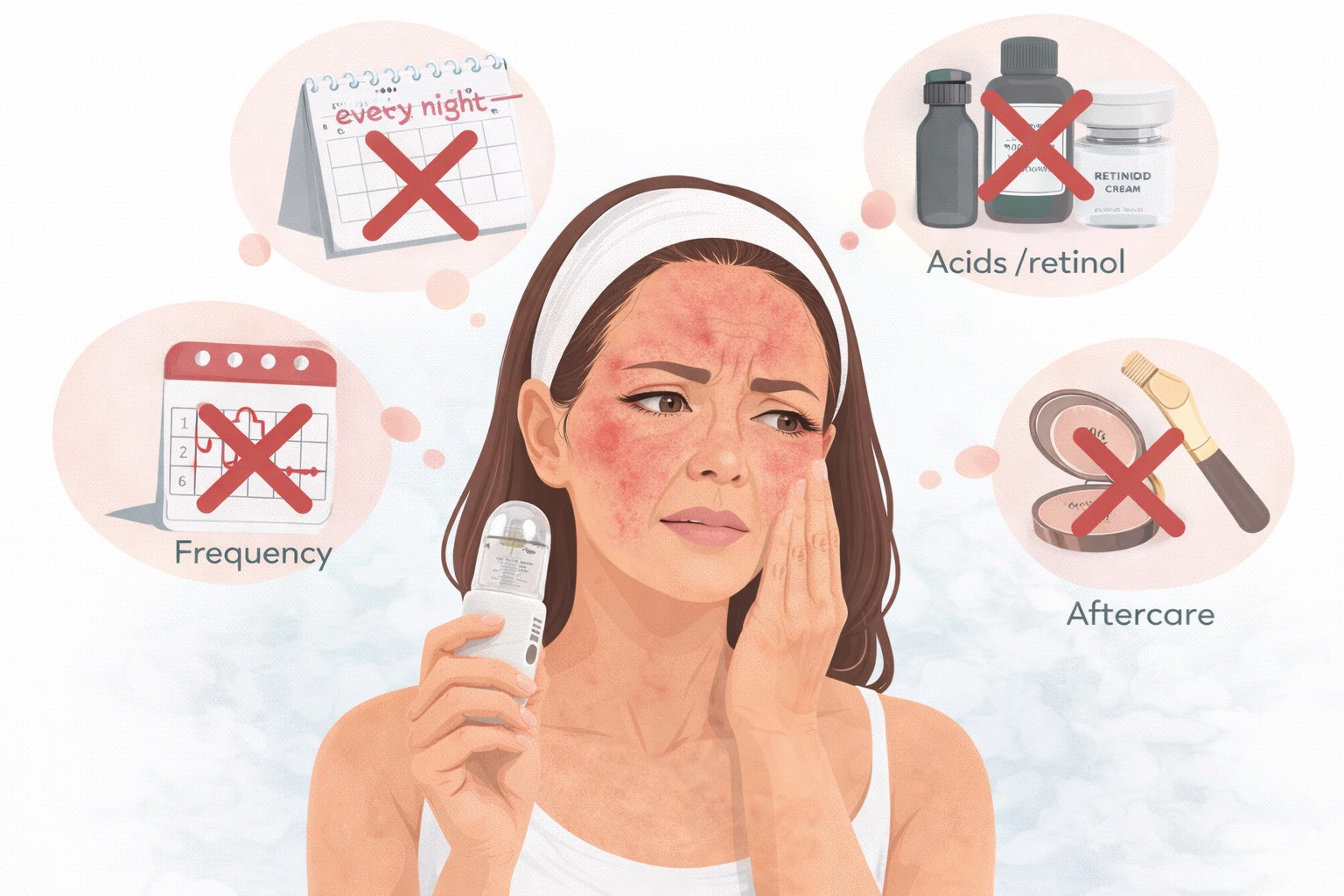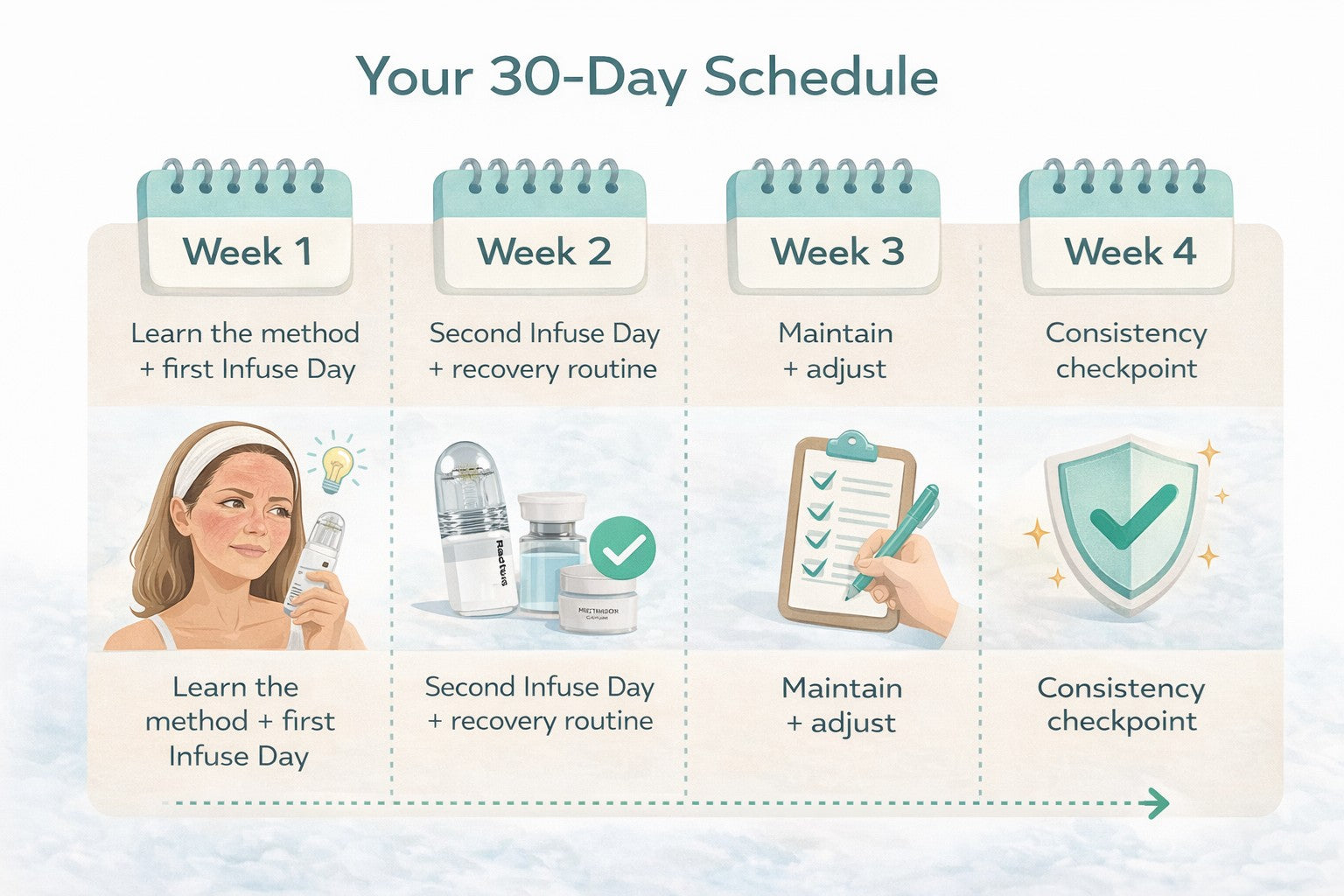 For best results, we recommend following the included 30-day protocol with spaced sessions (Infuse Days + Recovery Days). This pacing helps support your skin barrier and prevents overdoing it — which is where most people go wrong.