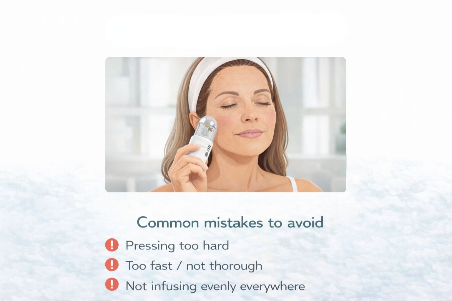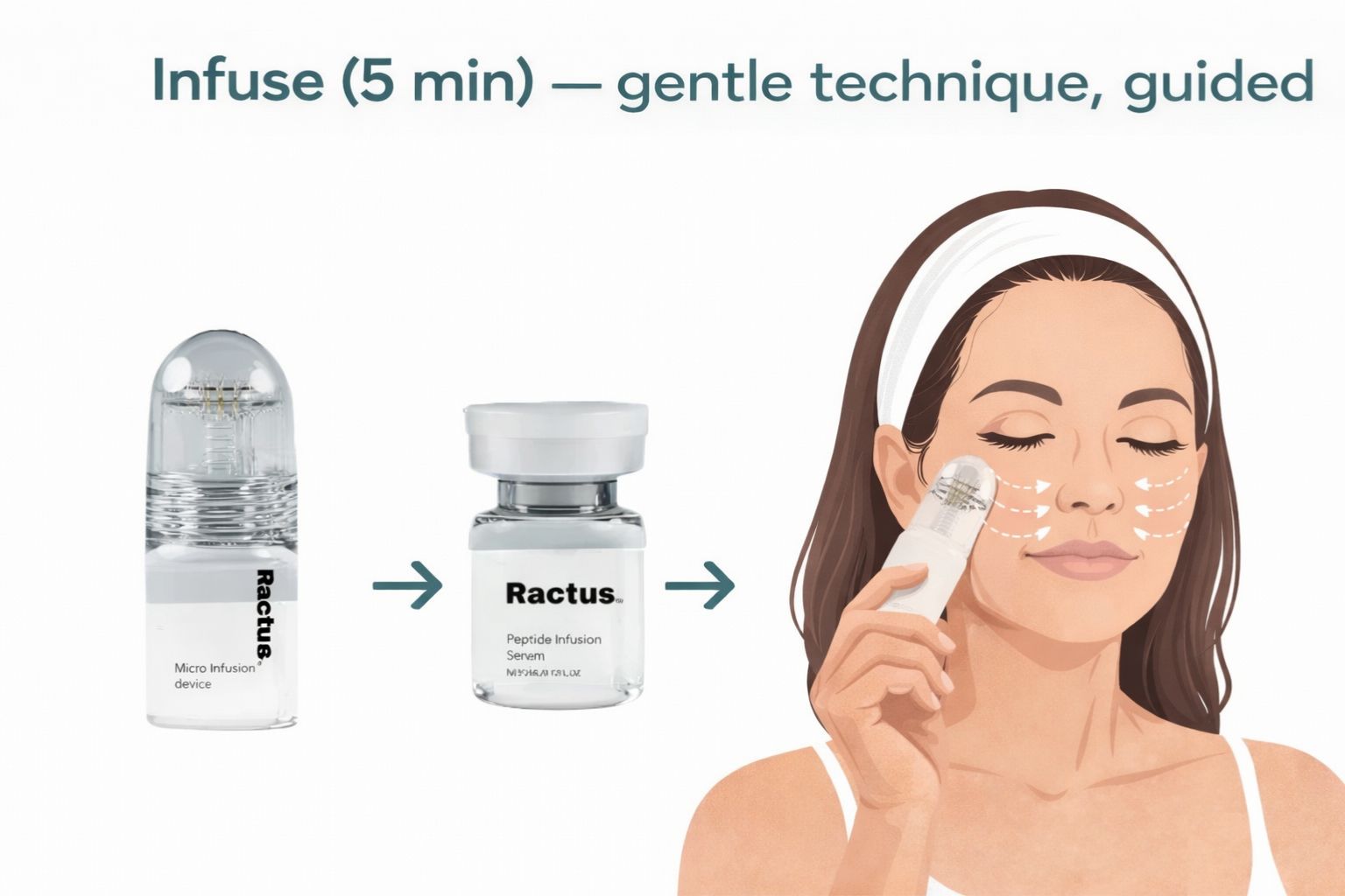 Fill your Micro Infusion Kit™ with 1 treatment, then use feather-light passes (no pressure) zone by zone: cheeks → forehead → jawline → neck. The goal is even infusion—not “harder.”